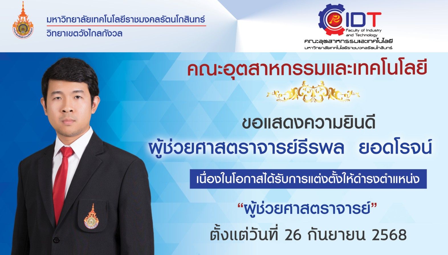 ในวันพุธ ที่ 1 ตุลาคม 2568 ดร.รักชนกชรินร์ พูลสุวรรณนธี คณบดีคณะอุตสาหกรรมและเทคโนโลยี พร้อมด้วยรองคณบดี คณาจารย์ หัวหน้าสาขา และบุคลากรการศึกษา เข้าร่วมประชุมคณะกรรมการบริหารคณะฯ ภายในคณะอุตสาหกรรมและเทคโนโลยี ครั้งที่ 8/2568 ณ ห้องประชุมคณะอุตสาหกรรมและเทคโนโลยี มหาวิทยาลัยเทคโนโลยีราชมงคลรัตนโกสินทร์ วิทยาเขตวังไกลกังวล