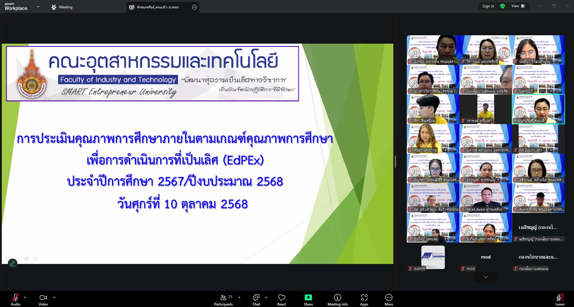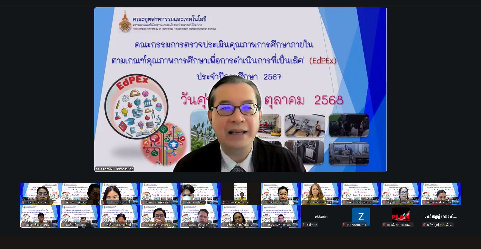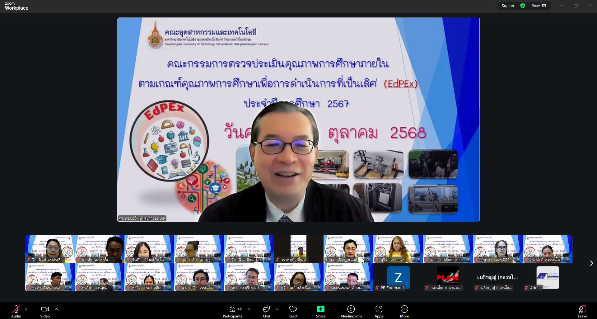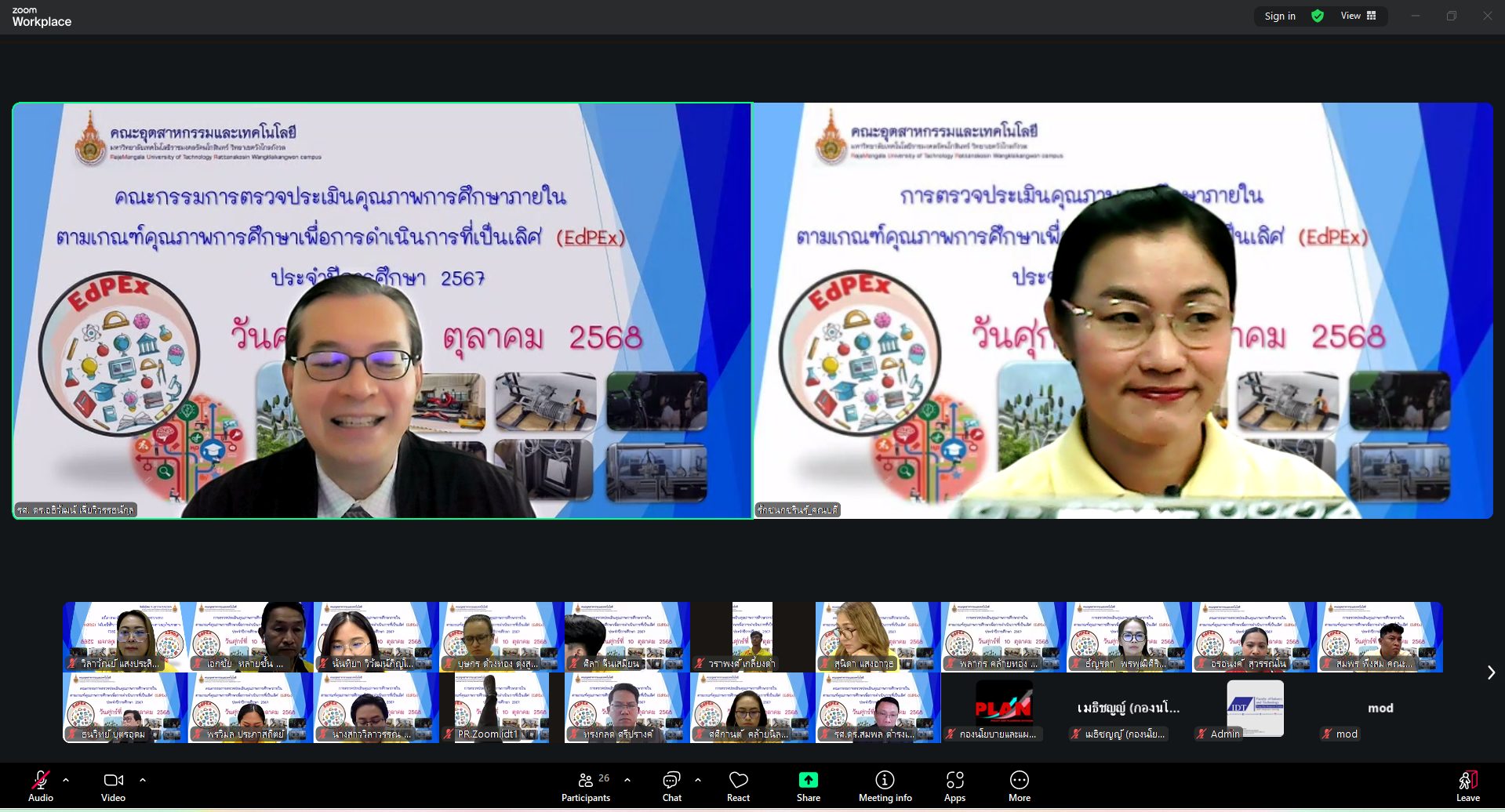 ในวันศุกร์ ที่ 10 ตุลาคม 2568 คณะอุตสาหกรรมและเทคโนโลยี เข้ารับการตรวจประเมินคุณภาพการศึกษาภายในตามเกณฑ์คุณภาพการศึกษาเพื่อการดำเนินการที่เป็นเลิศ (EdPEx) ประจำปีการศึกษา 2567 ปีงบประมาณ พ.ศ.2568 นำโดย ดร.รักชนกชรินร์ พูลสุวรรณนธี คณบดีคณะอุตสาหกรรมและเทคโนโลยี พร้อมด้วยรองคณบดี คณาจารย์ และบุคลากรการศึกษา เข้าร่วมการตรวจประเมินคุณภาพการศึกษา ผ่านสื่ออิเล็กทรอนิกส์ (Zoom Meeting) ได้รับเกียรติจากรองศาสตราจารย์ ดร.อธิวัฒน์ เจี่ยวิวรรธน์กุล (ผู้ตรวจประเมินรางวัลคุณภาพแห่งชาติ (TQA Assessor)) รองผู้อำนวยการฝ่ายแผนและพัฒนาคุณภาพ สถาบันแห่งชาติเพื่อการพัฒนาเด็กและครอบครัว มหาวิทยาลัยมหิดล (ประธานกรรมการ) รองศาสตราจารย์ ดร.สมพล ดำรงเสถียร (ผู้ตรวจประเมินรางวัลคุณภาพแห่งชาติ (TQA Assessor))หัวหน้าภาควิชาครุศาสตร์สถาปัตยกรรมและการออกแบบ คณะครุศาสตร์อุตสาหกรรมและเทคโนโลยี สถาบันเทคโนโลยีพระจอมเกล้าเจ้าคุณทหารลาดกระบัง (กรรมการ) รองศาสตราจารย์ ดร.ธนวิทย์ บุตรอุดม (ผู้ตรวจประเมินระบบคุณภาพภายในองค์กร (TQA IQA)) ประธานหลักสูตรปรัชญาดุษฎีบัณฑิต (รัฐประศาสนศาสตร์) คณะมนุษยศาสตร์และสังคมศาสตร์ มหาวิทยาลัยราชภัฏอุดรธานี (กรรมการ) และนางสาวอรอนงค์ สุวรรณโณ มหาวิทยาลัยเทคโนโลยีราชมงคลรัตนโกสินทร์ กองนโยบายและแผน งานประกันคุณภาพ (เลขานุการ)