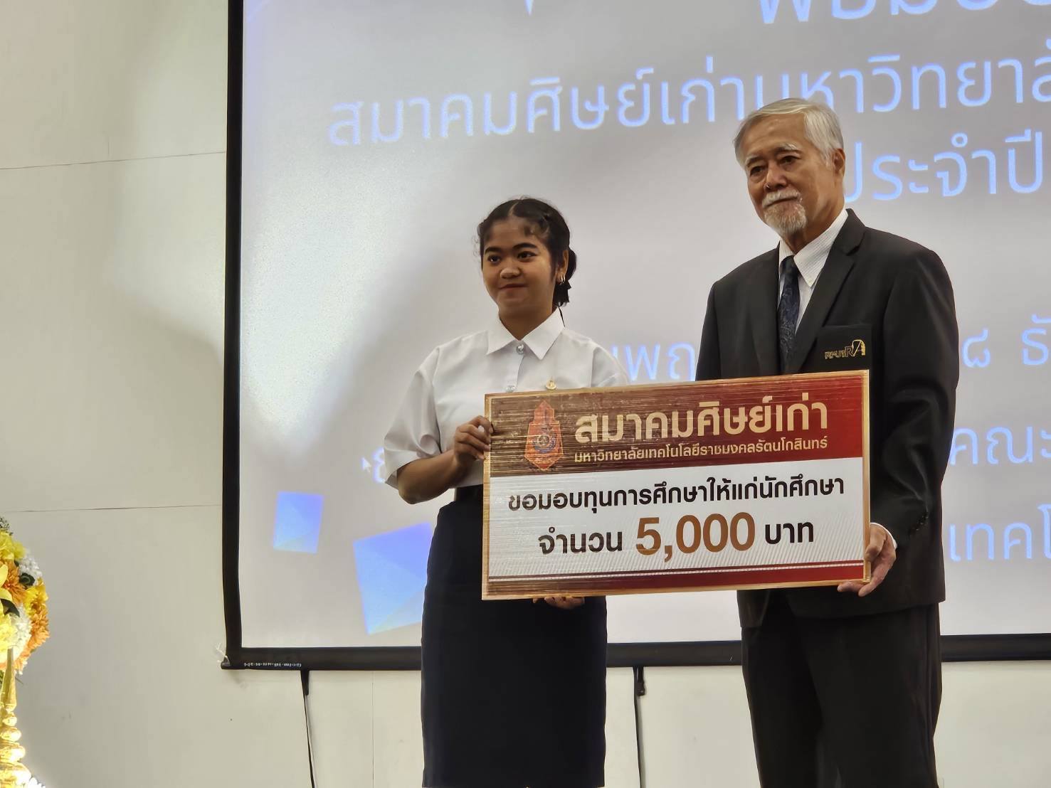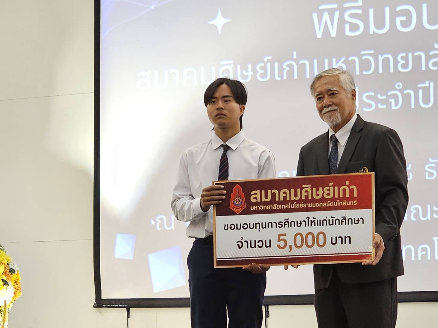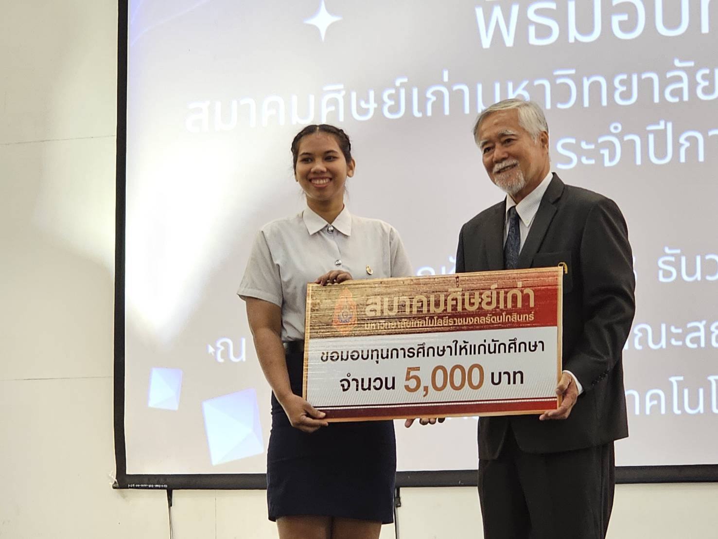 นำโดยอาจารย์สมพร พึ่งสม รองคณบดีฝ่ายกิจการนักศึกษานักศึกษาที่ได้รับทุนมีรายชื่อดังต่อไปนี้ 1.นางสาวกฤติญา ธนัชวราภัทร์ สาขาวิชาเทคโนโลยีวิศวกรรมไฟฟ้า 2.นายชัญวุฒิ โคดม สาขาวิชาวิศวกรรมอุตสาหการและการผลิต 3.นางสาวมนัสนันท์ ลือประเสริฐ สาขาวิชาเทคโนโลยีสื่อสารมวลชน ในการนี้ นางสาวมนัสนันท์ ลือประเสริฐ สาขาวิชาเทคโนโลยีสื่อสารมวลชนได้เป็นตัวแทนกล่าวขอบคุณสมาคมศิษย์เก่ามหาวิทยาลัยเทคโนโลยีราชมงคลรัตนโกสินทร์