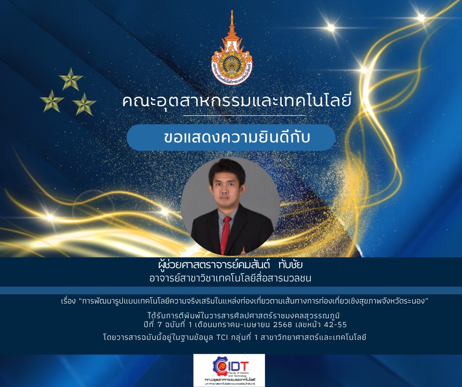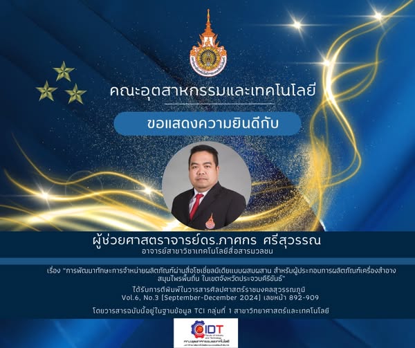 ขอแสดงความยินดีกับผู้ช่วยผู้ช่วยศาสตราจารย์ ดร.ภาสกร ศรีสุวรรณ อาจารย์สาขาวิชาเทคโนโลยีสื่อสารมวลชน ได้รับการตีพิมพ์ในวารสารศิลปศาสตร์ราชมงคลสุวรรณภูมิ Vol.6, No.3 (September-December 2024) เลขหน้า 892-909 เรื่อง “การพัฒนาทักษะการจำหน่ายผลิตภัณฑ์ผ่านสื่อโซเชี่ยลมีเดียแบบผสมผสาน สำหรับผู้ประกอบการผลิตภัณฑ์เครื่องสำอางสมุนไพรพื้นถิ่น ในเขตจังหวัดประจวบคีรีขันธ์” โดยวารสารฉบับนี้อยู่ในฐานข้อมูล TCI กลุ่มที่ 1 สาขาวิทยาศาสตร์และเทคโนโลยี