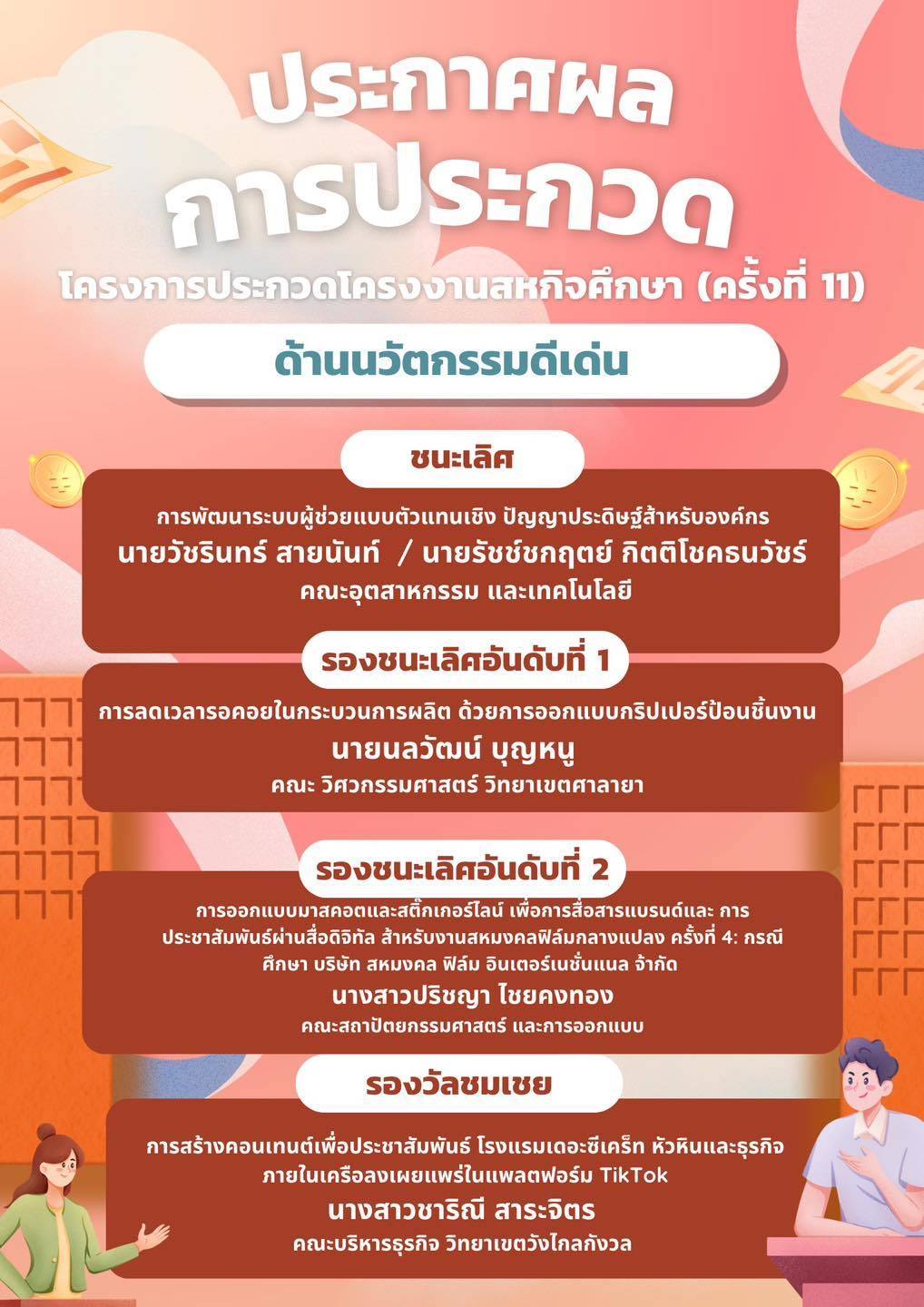 ในการได้รางวัล “ชนะเลิศ” ด้านนวัตกรรมดีเด่น ในการแข่งขันการประกวดโครงการประกวดโครงงานสหกิจศึกษา ครั้งที่ 11 ในวันที่ 27 มีนาคม 2569 ชื่อผลสหกิจ คือ “การพัฒนาระบบผู้ช่วยแบบตัวแทนเชิงปัญญาประดิษฐ์สำหรับองค์กร” โดยมี อาจารย์ ดร.จักรพงศ์ พลพงศ์ เป็นอาจารย์ควบคุมทีม