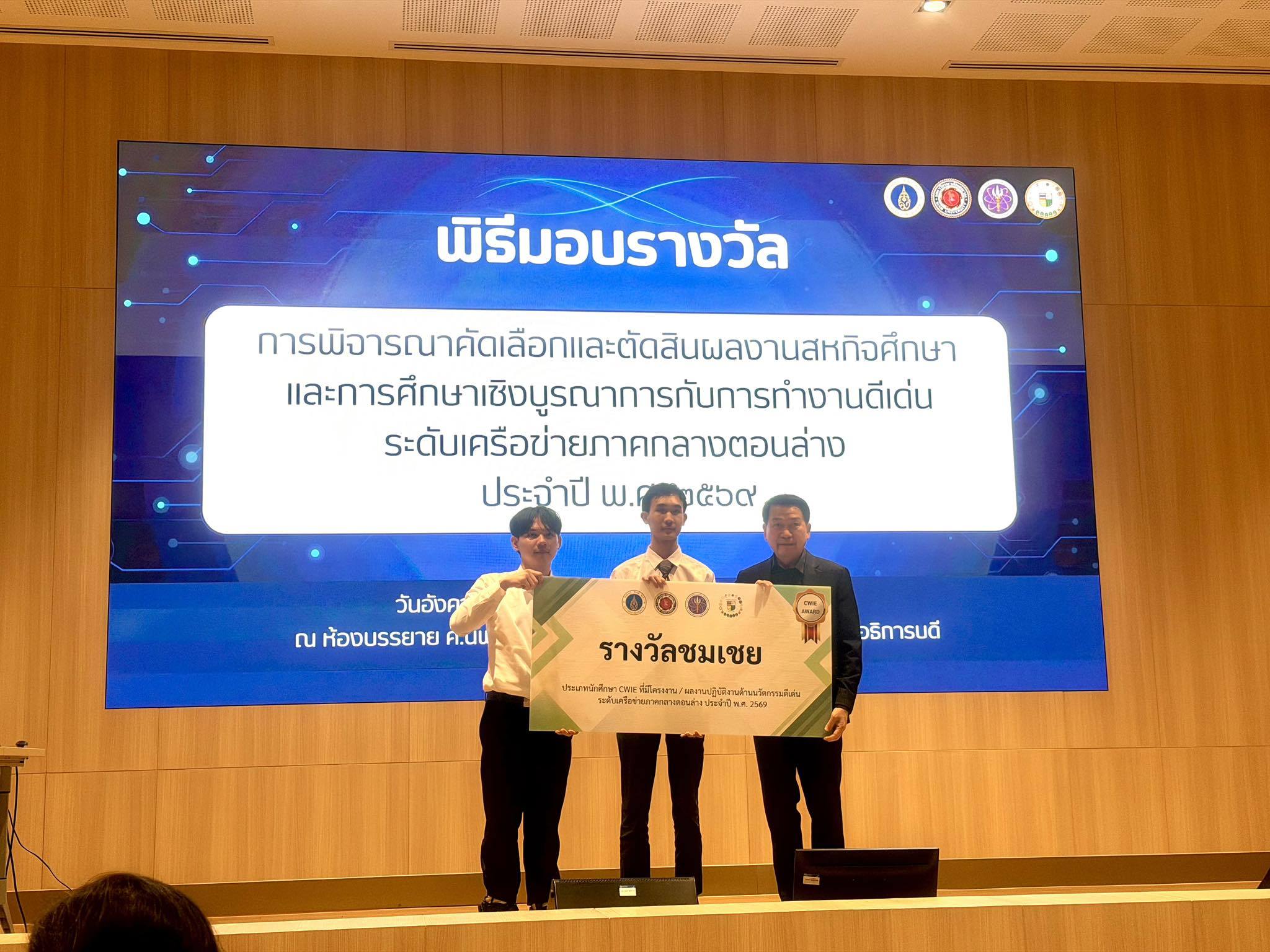 ในการได้รางวัล “รางวัลชมเชย” ด้านนวัตกรรมดีเด่น ในการประกวดผลงานสหกิจศึกษาและการศึกษาเชิงบูรณาการกับการทำงาน (CWIE) ระดับเครือข่ายภาคกลางตอนล่าง ประจำปี พ.ศ. 2569 ในวันที่ 31 มีนาคม 2569 ชื่อผลสหกิจ คือ “การพัฒนาระบบผู้ช่วยแบบตัวแทนเชิงปัญญาประดิษฐ์สำหรับองค์กร” โดยมี อาจารย์ ดร.จักรพงศ์ พลพงศ์ เป็นอาจารย์ควบคุมทีม